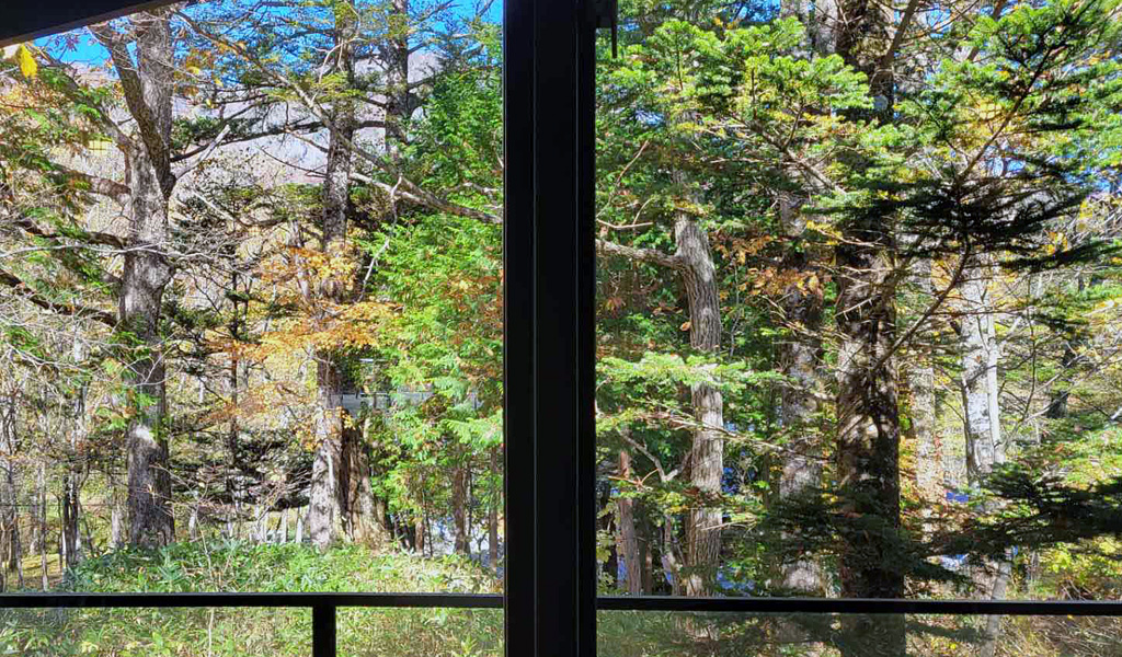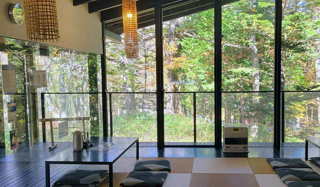 一面ガラス張りの美しい空間に自然が映えて、戸隠の充実したひとときが楽しめます。